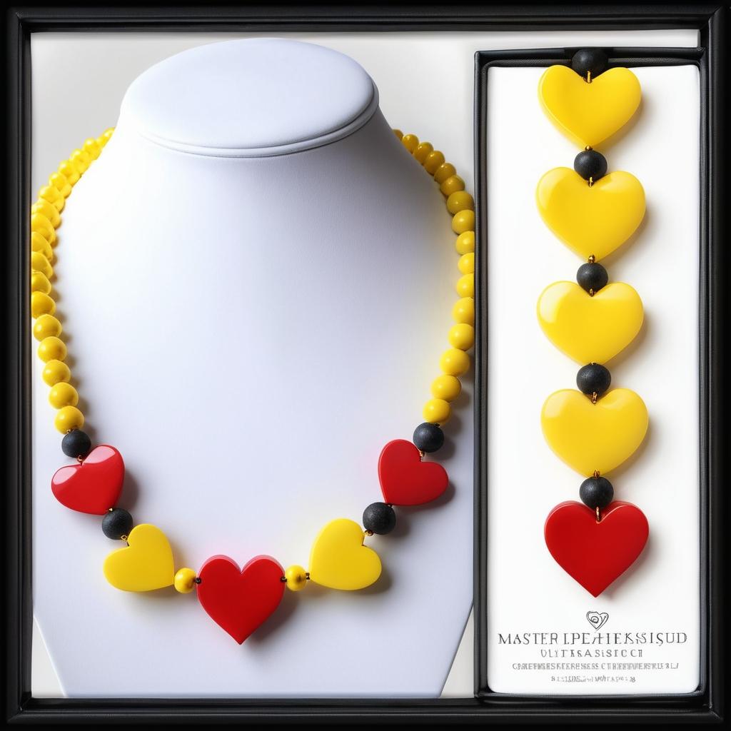 这幅手稿的项链设计展现了现代极简风格的核心理念。通过使用亮黄色的圆形串珠,设计师成功地营造出一种活泼而现代的视觉效果。红色心形吊坠不仅为作品增添了趣味性,同时也构成了视觉焦点。整体设计简洁明快,线条流畅,充分利用了色彩对比与几何对称性,展现出简约而不简单的设计风格。在现代极简设计趋势中,这样的作品通过减少元素达到更高的美学标准,同时保持了实用性与时尚感。创新的材料选择和工艺不仅提升了作品的质感,也使其在市场中具有独特的竞争力。