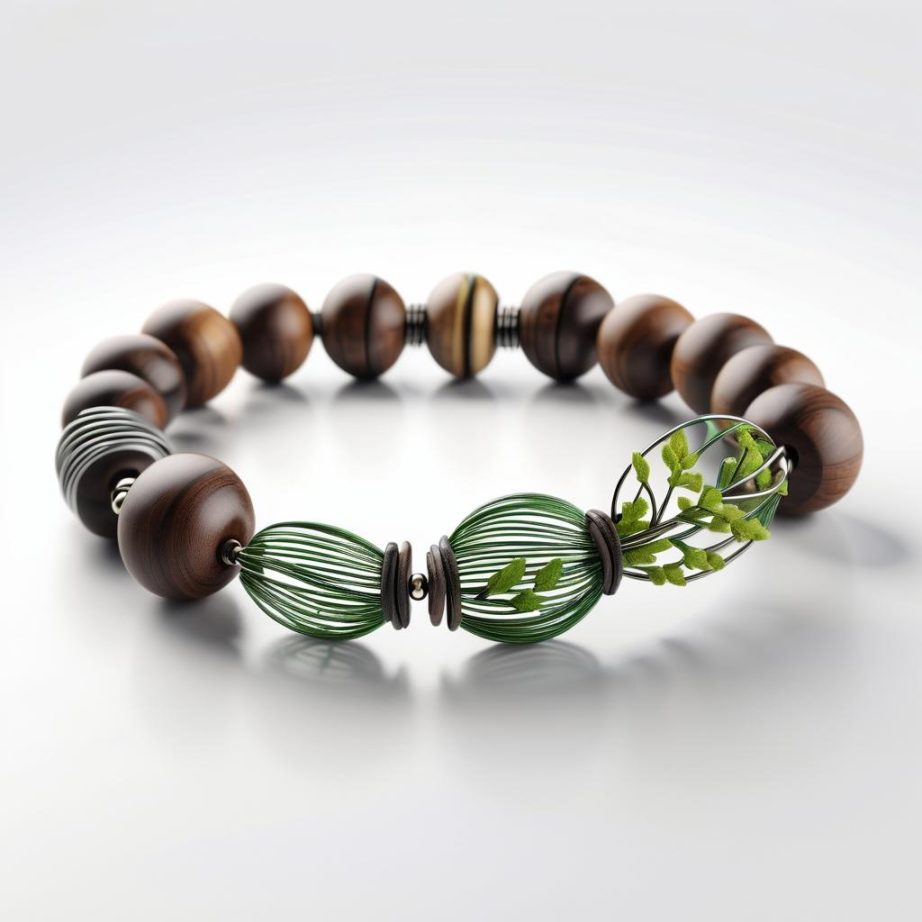 图片展示了一款具有自然灵感的手链设计。串珠的种类可能为木质珠,形状为不规则圆形,颜色为自然木色。整体设计采用绿色线条构成弯曲的藤蔓状结构,串联各个珠子,形成流畅的圆环。设计中的线条强调了自然的流动感和不对称的美学。中心悬挂一个较大的珠子,增加了设计的视觉重心。