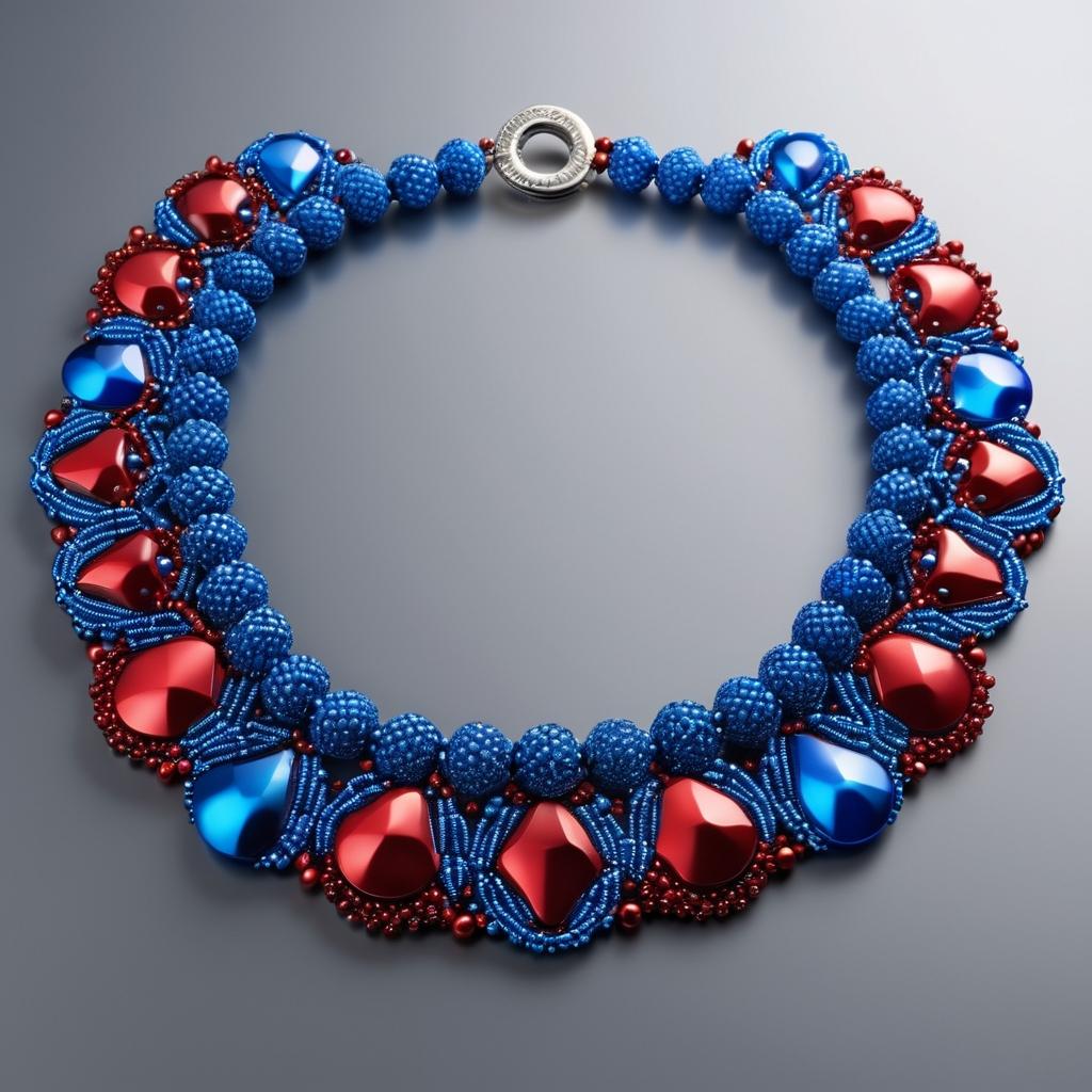 这幅图像展示了一个独特的色彩与形态的结合,通过蓝色、红色、紫色和粉色的搭配,创造出一种鲜明的视觉对比。设计的环形排列具有对称性,同时通过不规则的花瓣状形态增添了动态感。这种设计的灵感可以转化为当代珠宝作品,通过使用不同材质的串珠,如玻璃珠与金属珠,增强设计的奢华感与现代感。此外,中央吊坠的引入以及金属连接件的使用,可以提升整体设计的功能性与艺术性。这种具有艺术感染力的设计方案,不仅符合当前珠宝设计的趋势,也为设计师提供了丰富的创作灵感。